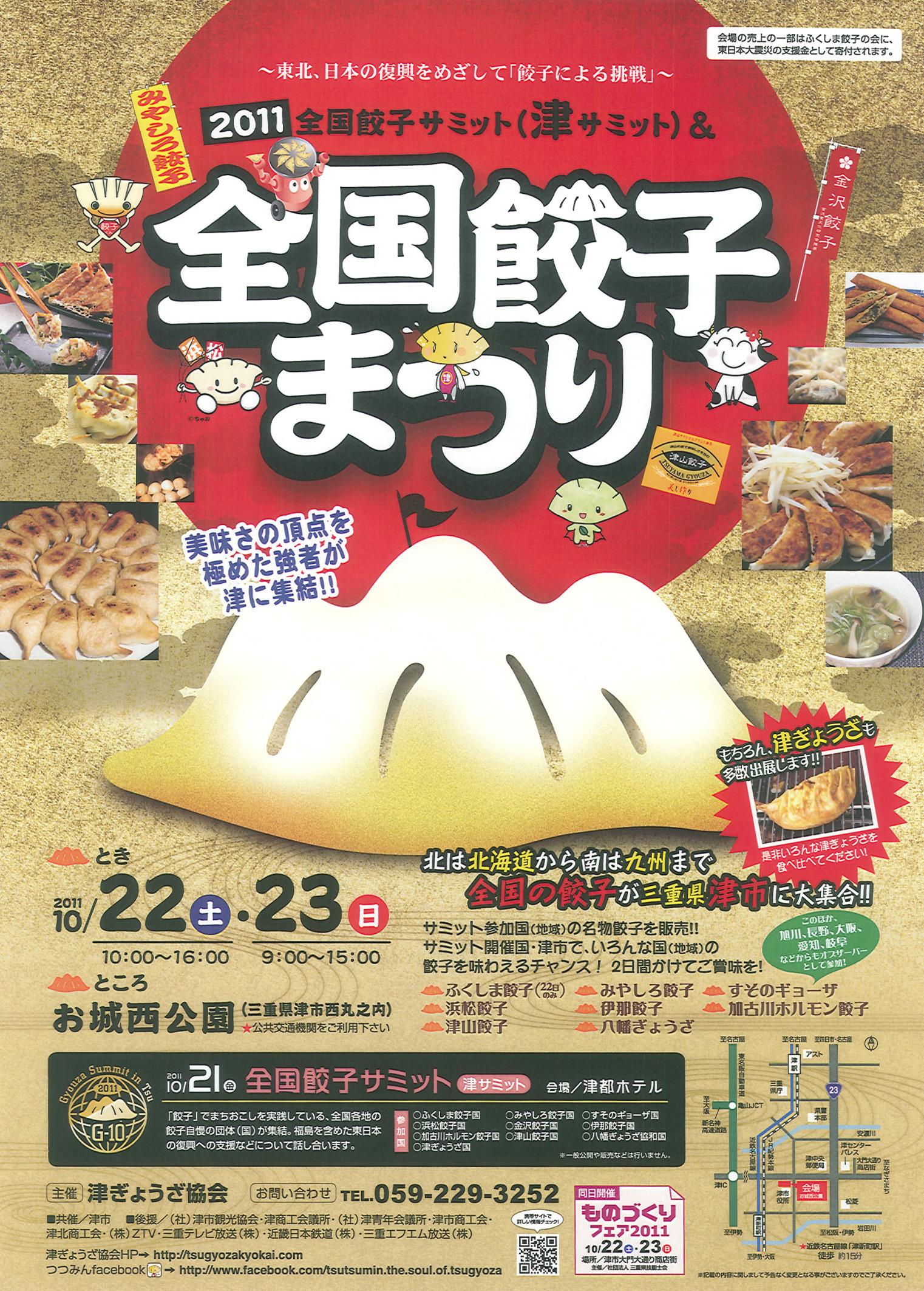 2011年10月22日(土)10時〜16時、10月23日(日)9時〜15時、津市のお城西公園で開催される、全国最大級の餃子の祭典「2011全国餃子サミット津サミット&全国餃子まつり」に出現します。
