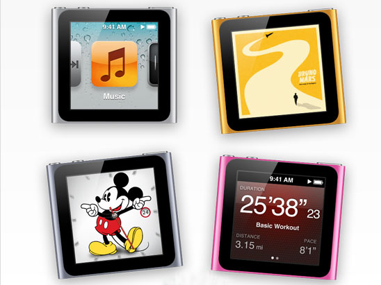 iPod nano(第6世代)はマルチタッチディスプレイとなり、スワイプ操作を利用した新インタフェースになりました。時計デザインが追加され、フィットネスアプリも組込まれています。値段も低価格化しました。