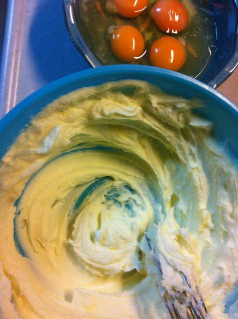2 別ボウルで、 バターと砂糖を入れて 泡立て器でまぜます! 写真のようになめらかになるまで。 | |