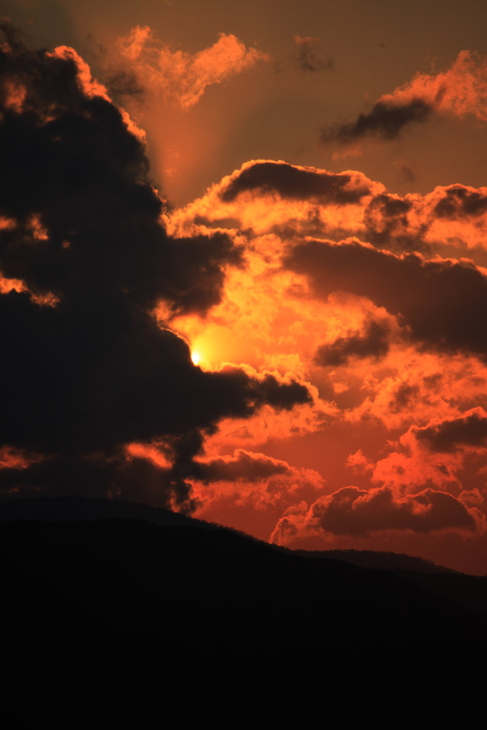 西の空に沈みつつ太陽。こうした撮影にはフィルタをいれるともっと燃えるような赤色がでます。