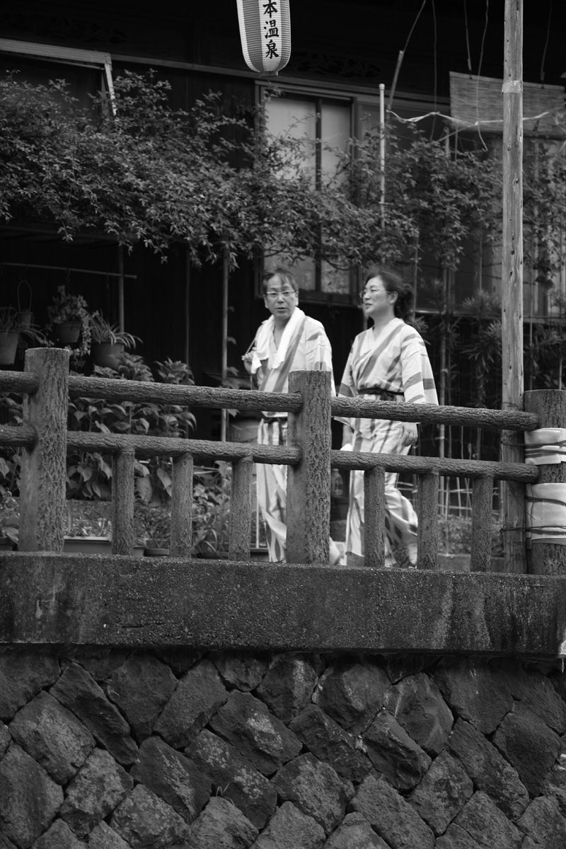 温泉街を歩く浴衣姿の風景。似合いますよね。モノクロの方が時代を感じることができます。