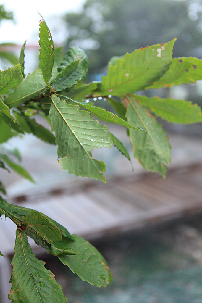 朝霧と湯煙にぬれた木々。これを手前にもってきて、後は全体をぼかしています。開放値2.8レンズならではの写真になりました。霧雨の雰囲気もあり、すごい湿度でした。