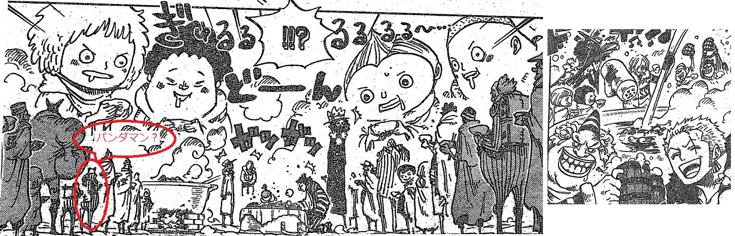 サンジは、新人類憲法奥義「99のバイタルレシピ」冷えきって疲れた体に“復活系”“海ブタ肉入りホルモンスープ”を巨大な鍋で作りました!美味しそうな料理を前に ヨダレを垂らしながらもいらないと言うモモの助!錦えもんは料理を食べ、モモの助に この者達は信用してもよいのだ、もう大丈夫、奴らもきっと無事と信じよう、生きようと言います。泣きながら食べるモモの助と錦えもん!モモの助が密航した事も関係がありそうですが、錦えもん&モモの助親子には一体何があったのでしょうか。その話に関連してこれからワノ国へ行く流れになるのでしょうか??