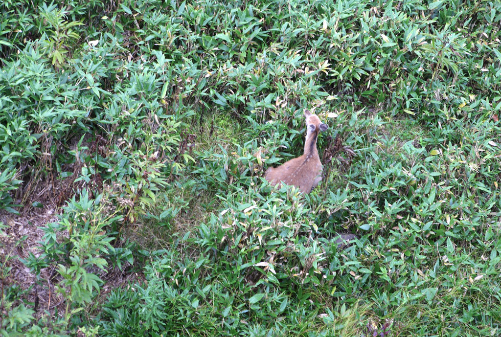 世界遺産に登録されている知床周辺。ここは自然と人間が共存する場所です。我々人間は高い場所から自然を見下ろす形で見学するのですが、この鹿は羆を警戒しているのです。かなり距離がありましたが、確かに羆がいました。