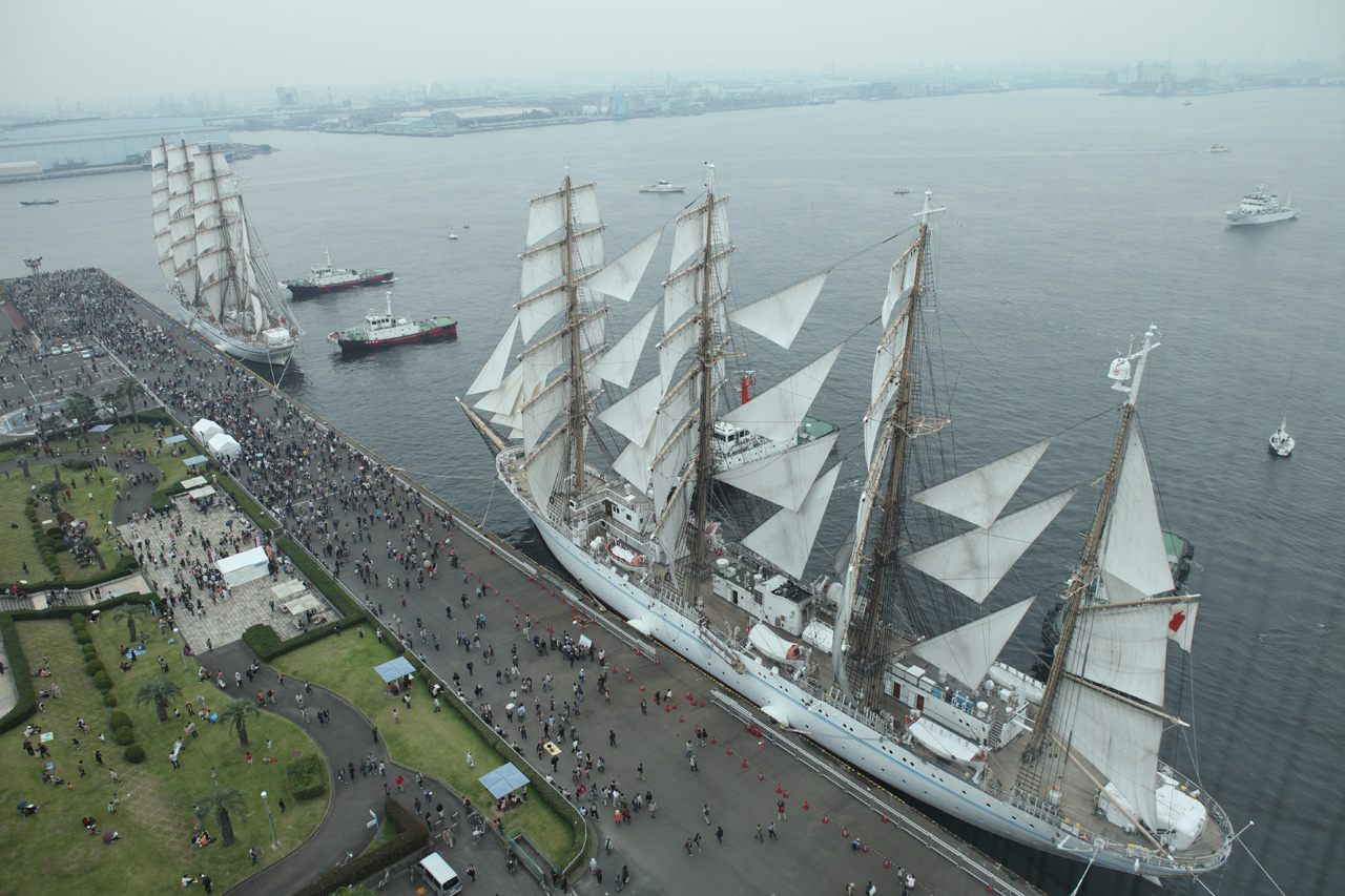 前回横浜で日本丸は、中にも入っていますし、晴れたときのセイルドリルも以前まにあ道でも紹介しています。今回曇りというのが本当に悔やまれますが、所有者(船の)関係で、今後同時入港はいつになるのか解らない状態ですし、今後2度とないかもしれません。この勇姿を撮影できたことは本当にカメラマンとしていいチャンスをもらったと思います。
