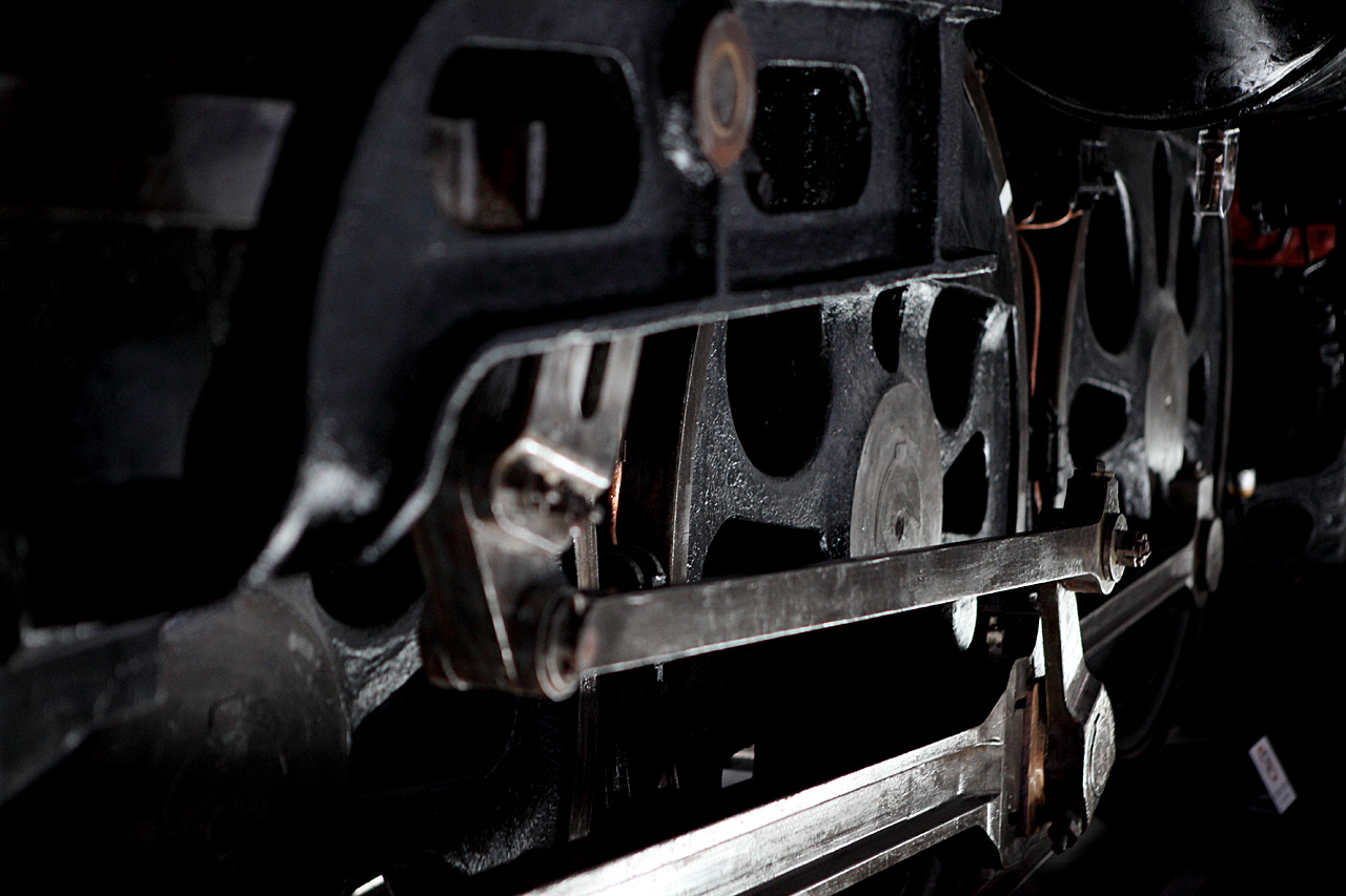「ガシュン」って車輪が動きそうです。鉄の硬いイメージを出すために絞りたいのですが、絞るとSSが長くなってしまいます。全体を撮影するのではなく切り取ることにより、被写体を強調することができます。