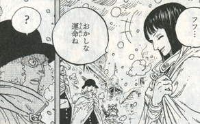 世界政府のそんな対応に、七武海が振り回せる権力の域を越えていると驚くサンジ!そんなサンジからの連絡を受けたロー!元帥サカズキ率いる海軍本部すら誤報に踊らされた事を知った藤虎!サカズキは立腹しており、マリージョアの五老星に掛け合ってくると言います。ローの所へ上半身を咲かせたロビンに、交渉は不成立、グリーンビットからすぐに脱出するとローが言いますが、ロビンはウソップと地下(小人族のトンタッタ王国)にいる事を告げ、約束の港には後で必ず向かうと言い、先に脱出してと伝えます。