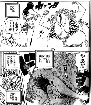 「男子禁制」で、「この国では 強い者こそ美しい」という価値観って事は、この国の皇帝 ハンコックって、実はゴツイお方だったりして・・・
