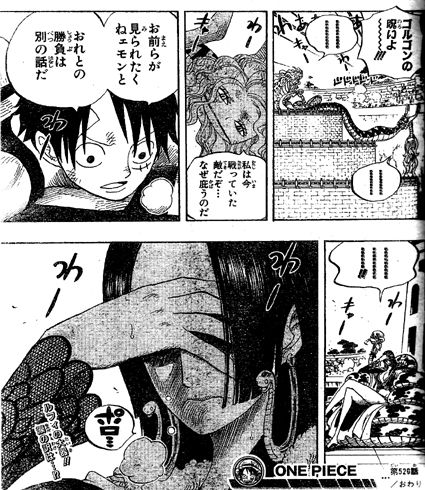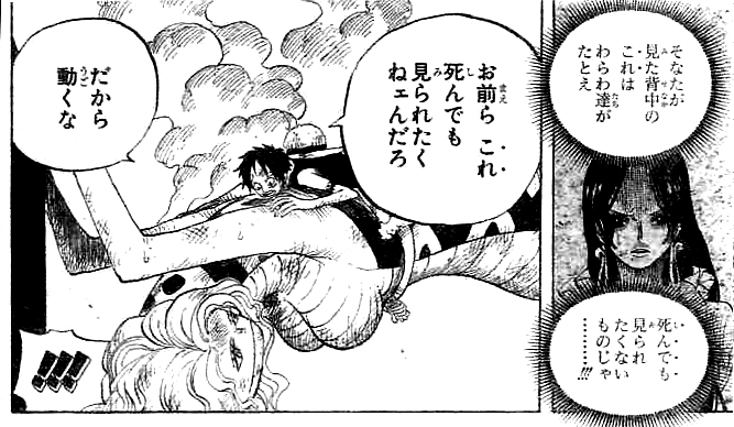 そして 剣の溝に落ちそうになったサンダーソニアの背中に飛び乗ったルフィ!それは追い打ちではなく、マリーゴールドの“炎の蛇神”の炎が サンダーソニアの衣服を燃やし、背中に刻まれた“ゴルゴンの目”が アマゾン・リリーの住人に晒されそうになったのを庇っての事でした!