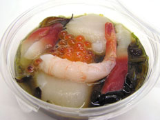 イクラ、ホッキ貝、ホタテ、甘エビ、キクラゲ、とびっ子、メカブの7素材を使った丼で、