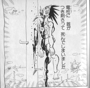 問題のシーンには、電柱に突き刺さって死んでいる男が描かれているのだが、