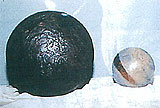 写真中央は、当時使用された日本最古の木製ボウリングボール