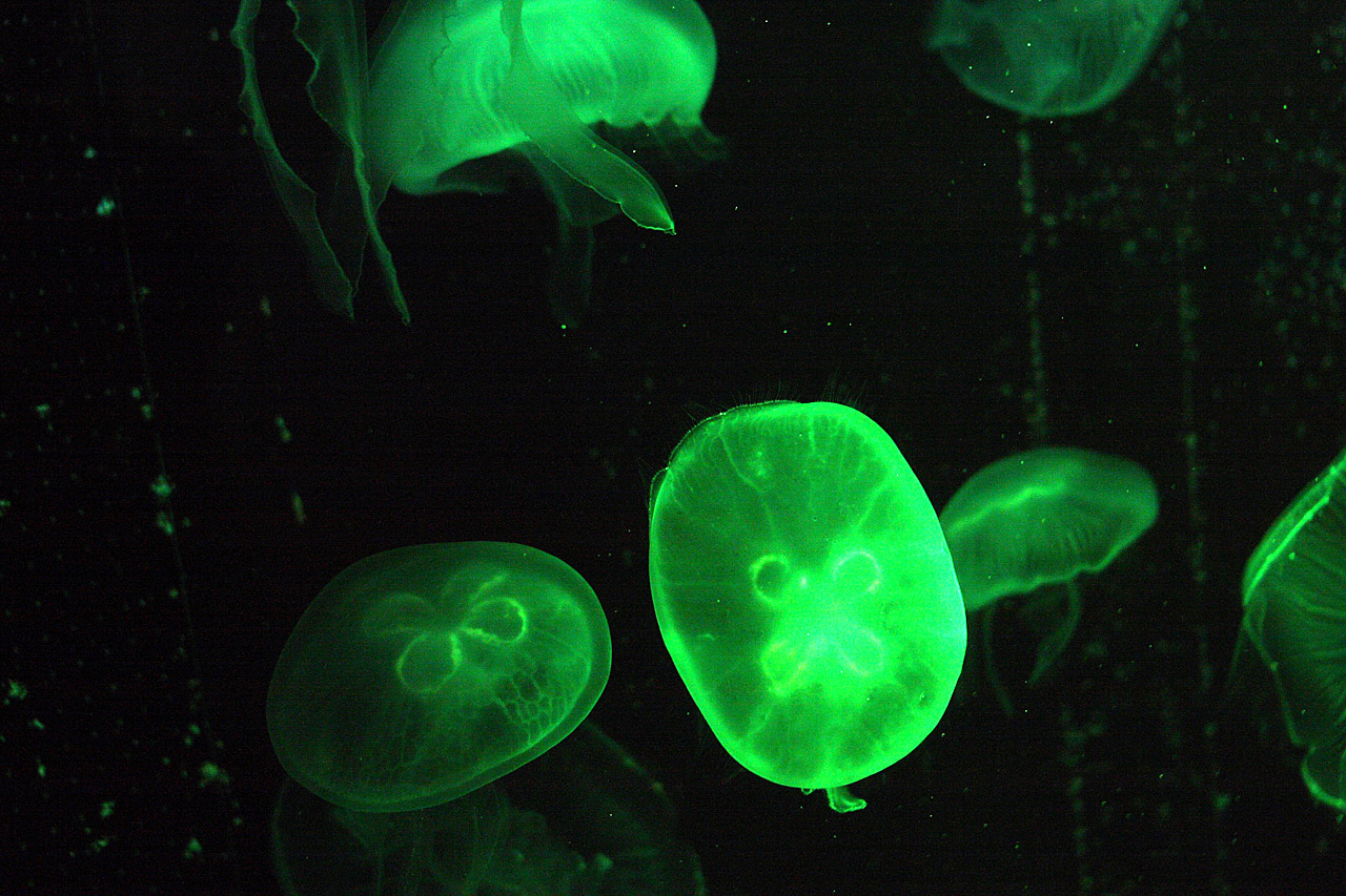 水族館では基本的にフラッシュ撮影が禁止されています。(魚が驚くからだそうで)しかし、殆どの水槽付近は暗く演出されており、カメラで魚たちを撮影するとピンボケになってしまったという経験がありませんか?特に動きの早い魚ですと厳しいですよね。更に、三脚撮影禁止となるともう証拠写真しか撮れない・・でもこんな面白い写真が撮れますよ、クラゲさん・・。好き嫌いはあると思いますが、幻想的かな?と思い投稿しました。意外と発光している瞬間であれば、シャッタースピードが稼げます。クラゲの動きを予測して撮影することが撮影のコツです。