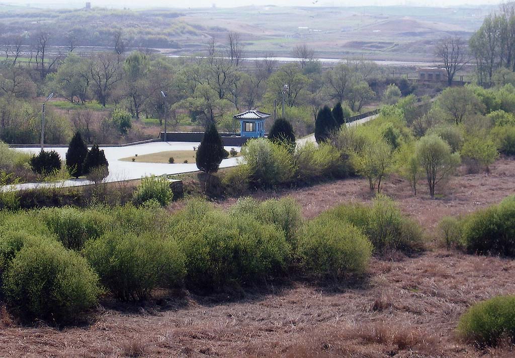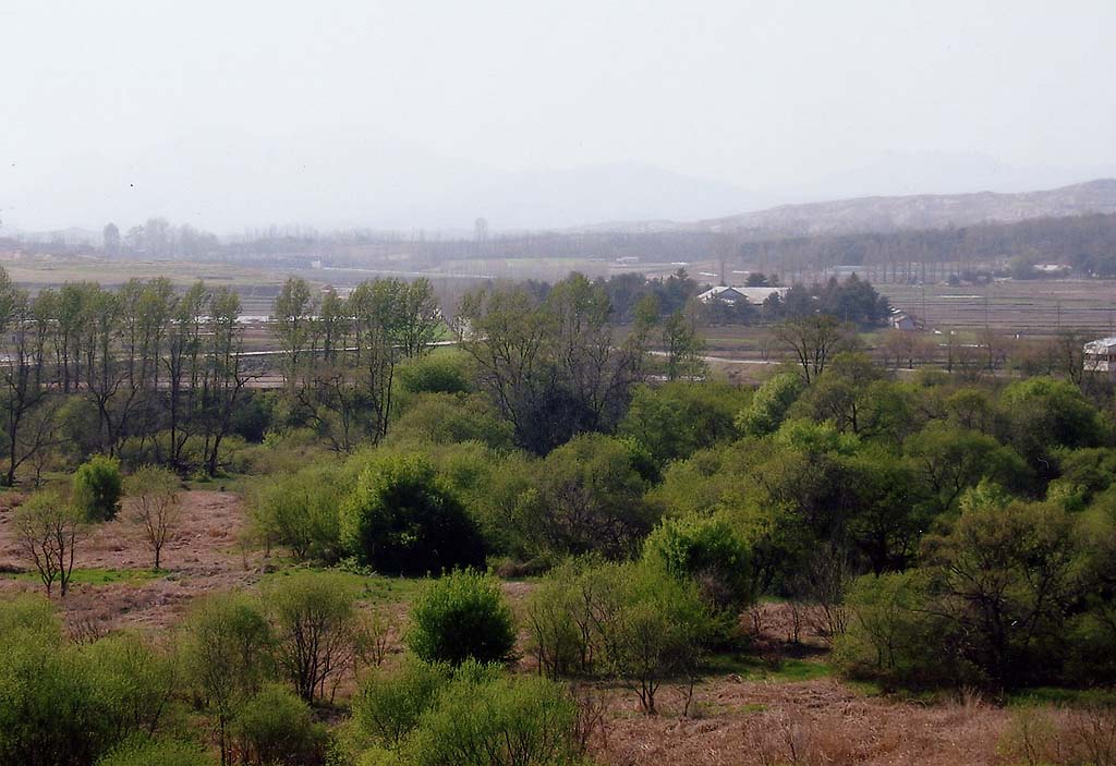 手前は韓国領、後方は北朝鮮であり、木々は生えていない(写真中)