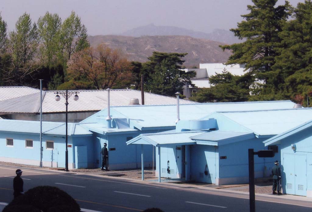 軍事停戦委員会会議議場。警備兵が建物に半身を隠して警護をしています。(写真右)