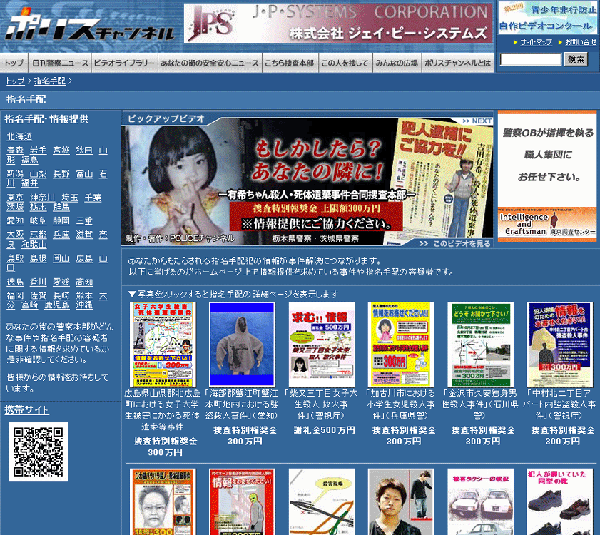 『ポリスチャンネル』は、ネットや映像を通じて良好な治安の確保に努めるNPO団体のサイト。例えば、トップページの「こちら捜査本部」をクリックすれば、全国の未解決事件がずらりと並べられており、昨年島根県で起きた「女子大学生被害死体遺棄等事件」や96年に起きた「柴又3丁目女子大生殺人 放火事件」、2000年に起きた「世田谷一家4人強盗殺人事件」などの発生日時や発生状況、犯人の特徴などがまとめられている。