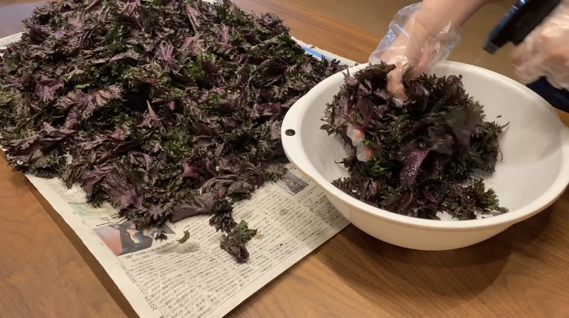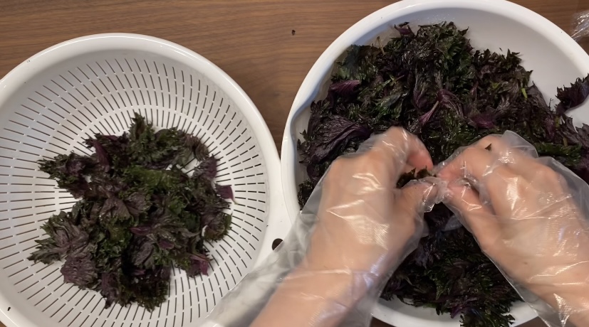 梅酢を少しかけ、塩を振り、全体重かけて揉みます。アクの入った黒ずんだ液が出たら捨てます。紫蘇から出てくる液が、鮮やかな透明感ある赤に変わるまで繰り返します。