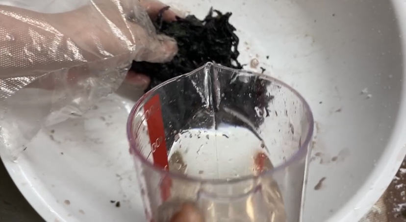 塩をかけて揉むと、浸透圧で水分が出て葉が小さくなります。出てきた黒っぽい汁が、アクです!
