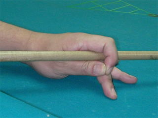 慣れるまではちょっと指が痛いかもしれませんがすぐに出来るようになります。ポイントは最後に曲げる人差し指以外は出来るだけ伸ばして置くこと。そして親指と人差し指がキューに触れる面積を出来るだけ多くとるようにすることです。