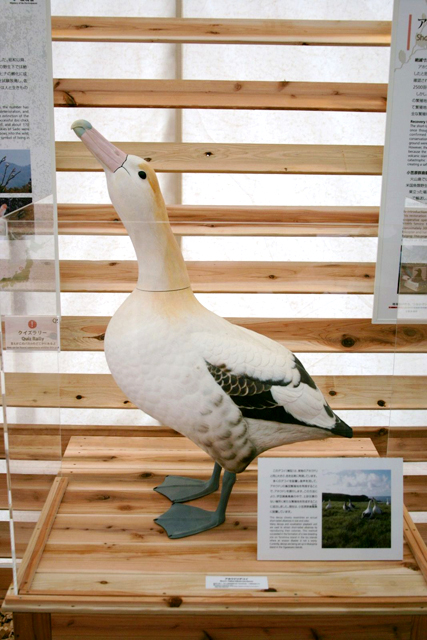 【画像右】アホウドリのデコイ(模型):アホウドリの集団繁殖の習性を利用して、デコイをたくさん配置し、アホウドリを呼び寄せます。これにより、安全な土地での繁殖に成功しています。