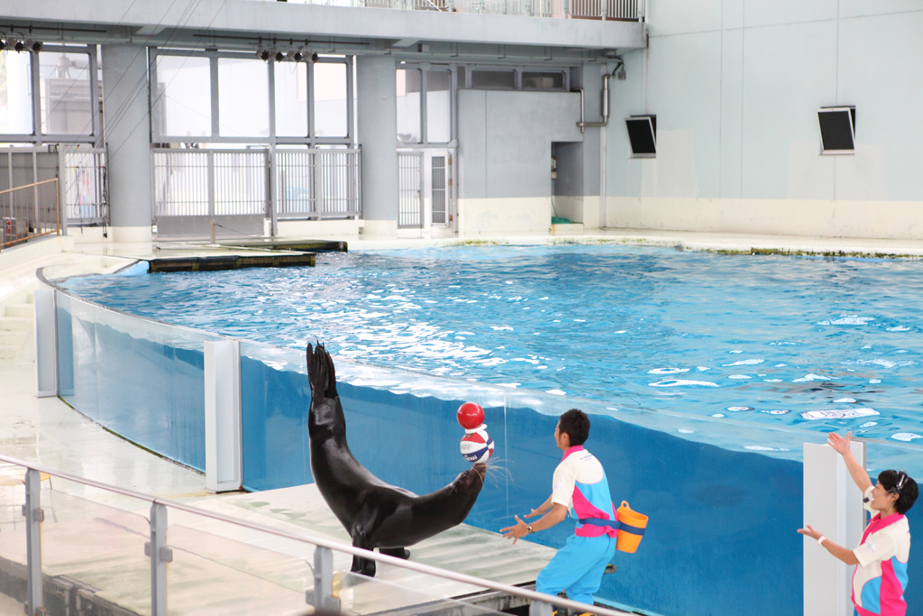 定番のアシカのショー。一件2つのボールを載せているように見えますが