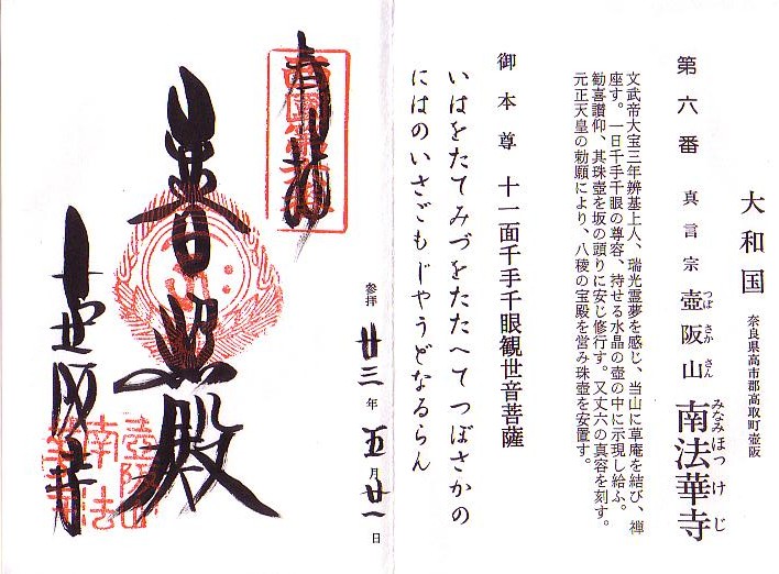 今日は西国観音霊場4番「槇尾山施福寺(槇尾寺)」・5番「紫雲山葛井寺」・6番「壷阪山南法華寺(壷阪寺)」・7番「東光山岡寺(龍蓋寺)」・8番「豊山長谷寺」・9番「興福寺南円堂」に参拝しました。