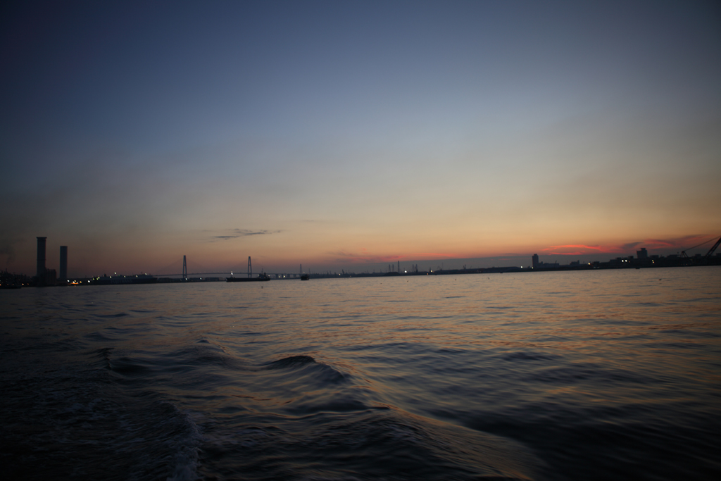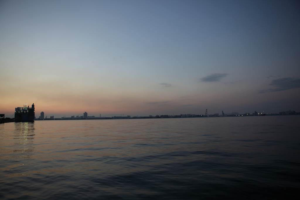 フラワーパークを後に、水族館に帰ります。どっぷりと日も暮れて名古屋港に闇が迫ってきています。