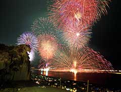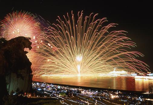 2枚目の写真は400メートル沖合いに浮かべたイカダ(鉄骨製とのこと)に重さ250kgの三尺玉(!)を