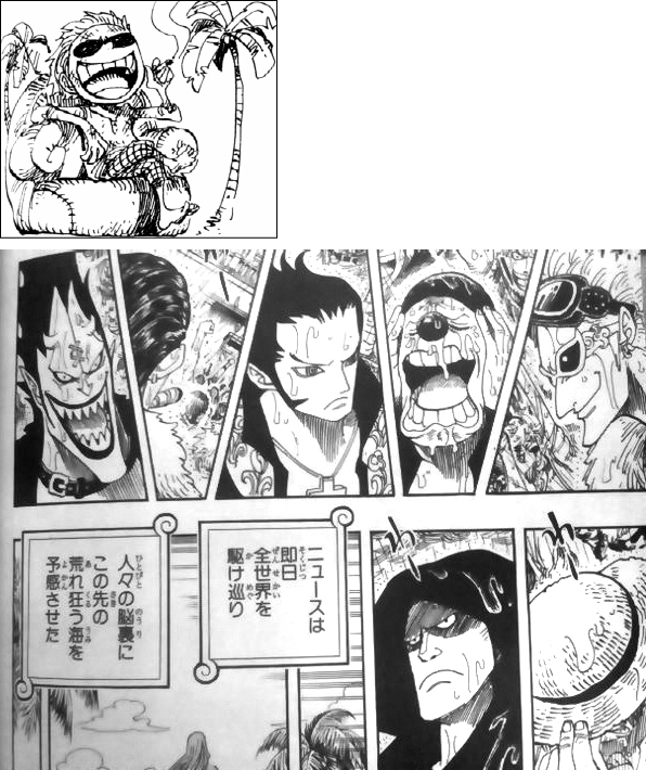 世界政府のそんな対応に、七武海が振り回せる権力の域を越えていると驚くサンジ!そんなサンジからの連絡を受けたロー!元帥サカズキ率いる海軍本部すら誤報に踊らされた事を知った藤虎!サカズキは立腹しており、マリージョアの五老星に掛け合ってくると言います。ローの所へ上半身を咲かせたロビンに、交渉は不成立、グリーンビットからすぐに脱出するとローが言いますが、ロビンはウソップと地下(小人族のトンタッタ王国)にいる事を告げ、約束の港には後で必ず向かうと言い、先に脱出してと伝えます。