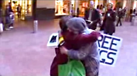 「FREE HUGS(ハグしよう)」と書かれたボードを持って通行人に呼びかける青年。