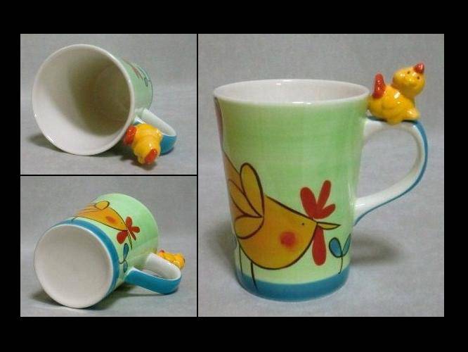 ハンドペイント/手描き ニワトリ&ヒヨコ ハンドルには、雛/ヒヨコが乗っています。可愛らしいカップです!