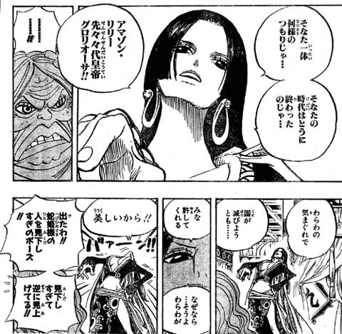 一方ルフィは、海賊船を もし借りれてもナミがいないと漂流してしまう事に気付き、偉い人にシャボンディ諸島まで送ってもらうために九蛇城へ潜入!