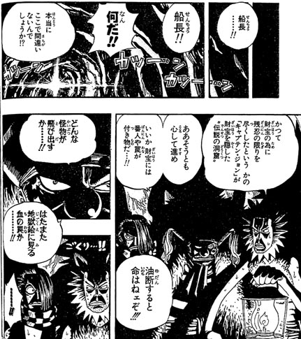 バギー一味がグランドラインの髑髏のような山のある とある島の洞窟を進みながら、かつて財宝の為に残忍の限りを尽くしたというキャプテン・ジョンの財宝を探していました。