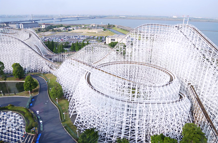 ホワイトサイクロン→世界最大級の木製ジェットコースター。振動が激しい。