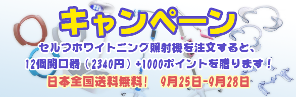 9月25日-9月28日、弊社はセルフホワイトニング照射機を注文すると、12個開口器(2340円)+1000ポイントを贈るというキャンペーンを行っています。<o:p></o:p>