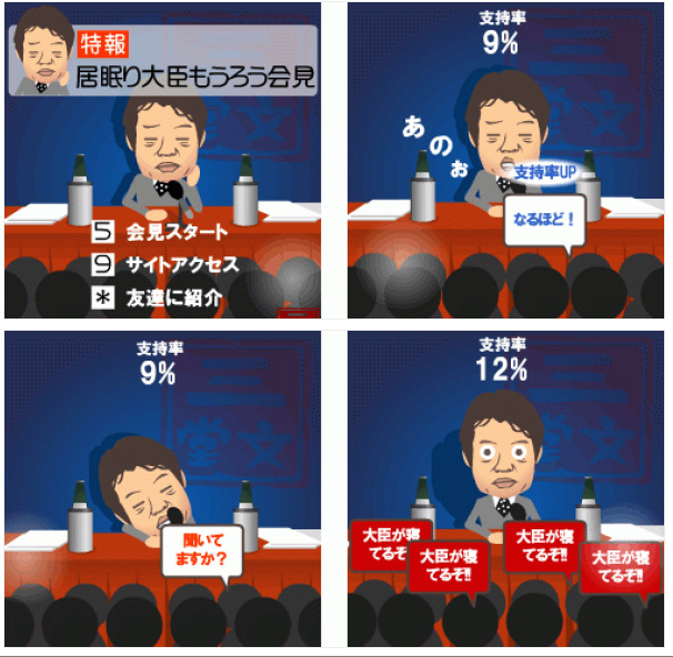 記者の質問に答えながらすきを見て居眠りするという携帯電話向けFlashゲームを