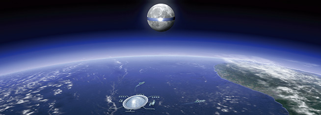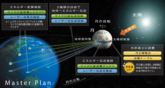 月の赤道上に太陽光発電パネルを敷き詰めて発電し、そのエネルギーをマイクロ波やレーザー光に変えて地球に送るシステムです。