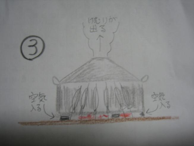図3、それから燻製器をかぶせる。小さい足があるので地面との隙間から空気が入り、