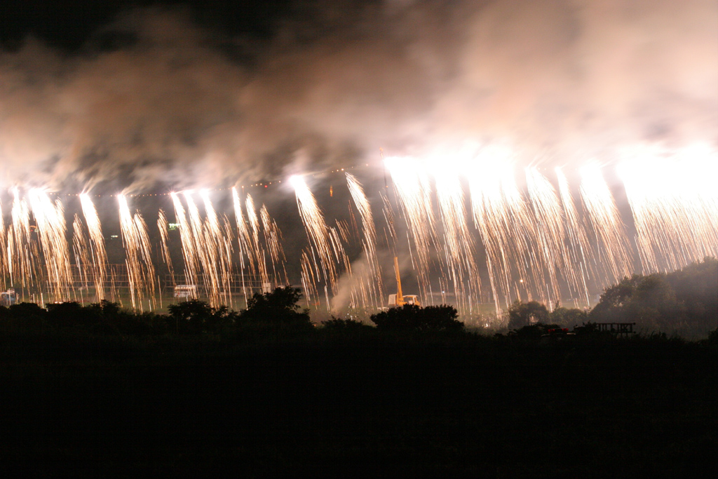 さらに、スローシャッターですので、花火の弾道も風下に流れる、そのため