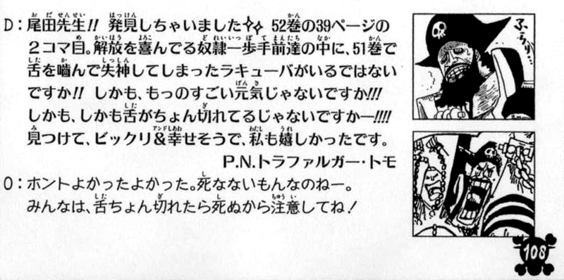発売されてもうかなり経ちますが、 第 600 話の1ページ目 2コマ目(厳密には3コマ目)のチョッパー(獣型)が走っている場面で、第 502 話の人間オークションで舌を噛んだラキューバが後ろで酒を飲んでいます! つまり彼は2年間あそこにいたというわけです! 以上マメ知識のコーナーつでした。