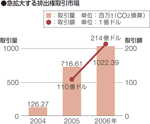 世界全体での排出権取引の市場規模は、2007年時点で約400億ユーロ(約6兆円)前後で毎年拡大を続けており、2012年の京都議定書の効力切れのあたりでは、相当多くの取引がされると思われます。