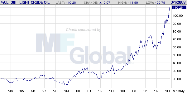 17日の東京工業品取引所で、中東産原油の先物価格(4月渡し)の終値は、1バレル=10.23ドルとなり、2001年9月の取引開始以来、終値で初めて100ドルを超えました。