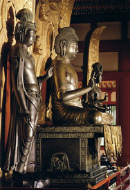 奈良県は薬師寺の金堂にある薬師三尊像(国宝)。 皆さんも教科書などで目にした事があるかと思います。 この薬師三尊像、学校教材などには、 必ずこのような斜めからのアングルで撮影された写真が掲載されています。 それはなぜでしょう?