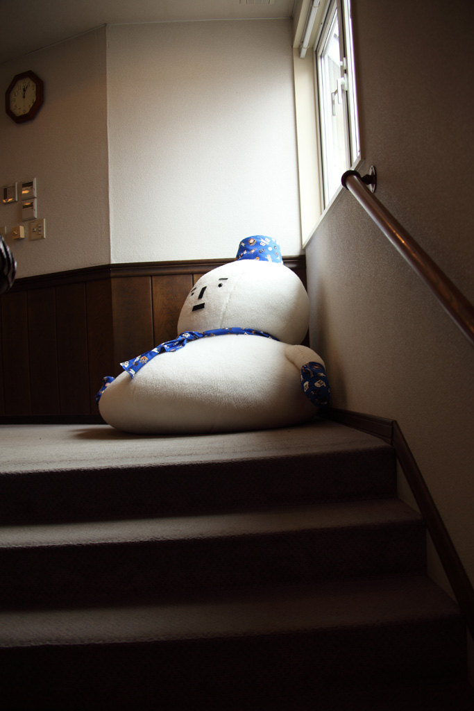 この写真も資料館で撮影したのですが、2階に上がっていく途中に面白いものを発見。窓から降り注ぐ陽に雪ダルマだ溶解している感じ。面白いアングルで撮影してみました。