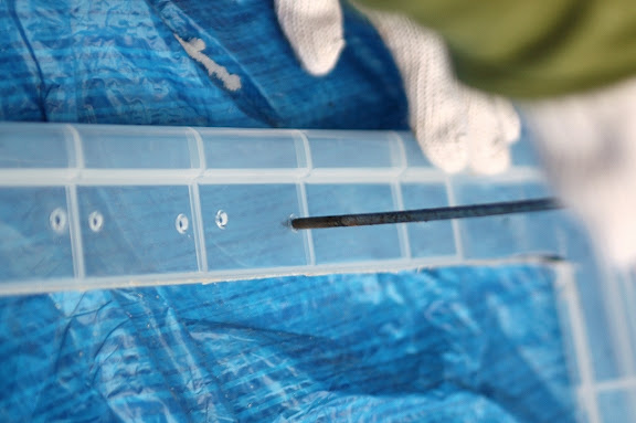 キリをバーナーで熱して、金網を固定するための穴をあける!!