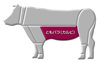 1頭の肉牛から約40キロのカルビ肉がとれ、赤身そのものは硬いが細かく入った脂肪分が多いため全体として柔らかく、旨味に富む。