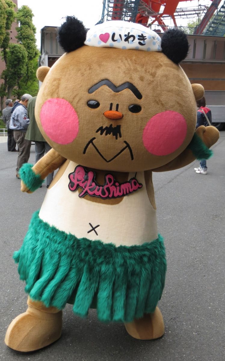 | いわき市観光情報ナビゲーター。 本名 いわきフラ次郎 いつも温泉気分の手ぬぐいを頭に載せ、Fukushimaをかたどった手作りのレイを首から提げ、ワイルドさがにじみ出るランニングの日焼けあとが特徴。 筋金入りの競輪ファンで日焼けはいわき平競輪場じこみだとか。 |