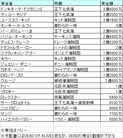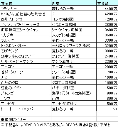 ※修正しました!(2008/9/5)麦わらの一味の懸賞金は下記の通り。