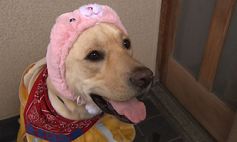 駄菓子屋さんを出ると、そこには沢山のファンの皆さんが待っていてくれた。その中のワンちゃんが、大型犬ながら100着以上の洋服を持っていると聞き、自宅を訪問。その中のにあった帽子をお借りして、まさはる君が試着するのだが・・・。これは似合っているのか!?