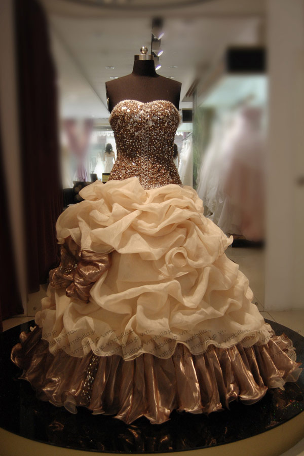 緻密に施されたビーディング、大胆的配色、スカートに花びらのようなシャーリングは最大の特徴。大人っぽいエレガントな姿を描き出す、照明に当たるとさまざまな表情を見せるので、夜宴にもおすすめ。